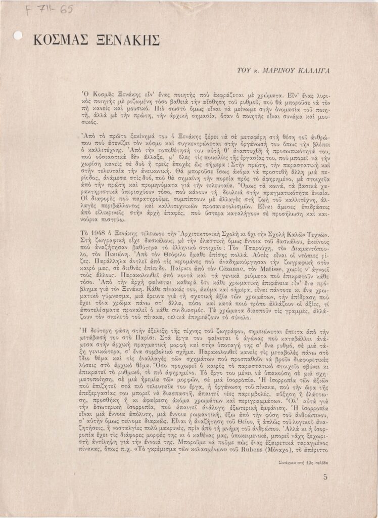Απόκομμα, χαρτί ιλλουστρασιόν, 28×21 εκ., στα ελληνικά, κριτικής του Μαρίνου Καλλιγά για το εικαστικό έργο του Κοσμά Ξενάκη. Δίνονται βιογραφικές πληροφορίες για τον καλλιτέχνη ενώ σχολιάζεται η καλλιτεχνική του πορεία.