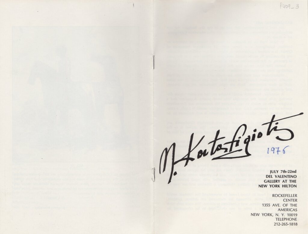 Κατάλογος, χαρτί ιλλουστρασιόν, 5 φφ, 21,5×14 εκ., στα αγγλικά, ατομικής έκθεσης ζωγραφικής του Μενέλαου Καταφυγιώτη.