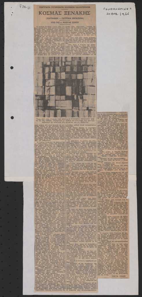 Απόκομμα, χαρτί, 47×21 εκ., στα ελληνικά, δημοσίευσης κειμένου για τον Κοσμά Ξενάκη. Δίνονται βιογραφικές πληροφορίες, η καλλιτεχνική του πορεία και αποσπάσματα συνέντευξής του.