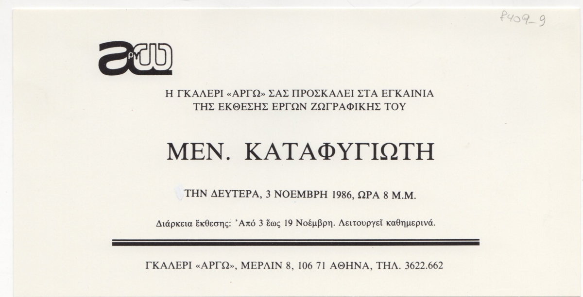 Πρόσκληση, χαρτί ιλλουστρασιόν, 10×19.5 εκ., στα ελληνικά, ατομικής έκθεσης ζωγραφικής του Μενέλαου Καταφυγιώτη, η οποία διεξάγεται στην γκαλερί Αργώ.