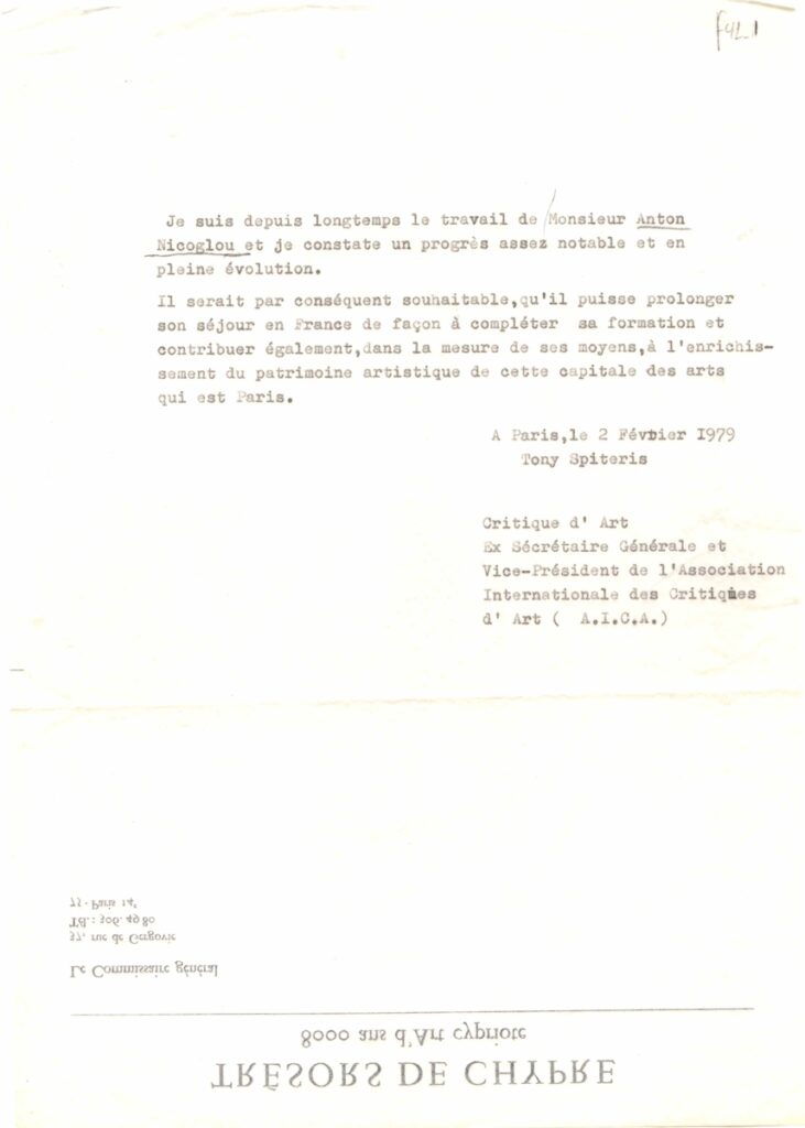 Συστατική επιστολή, δακτυλόγραφη, ριζόχαρτο, 29,5×21εκ, στα γαλλικά, από τον Τώνη Σπητέρη, για τον Αντόν, προκειμένου να παρατείνει ο τελευταίος την παραμονή του στη Γαλλία.