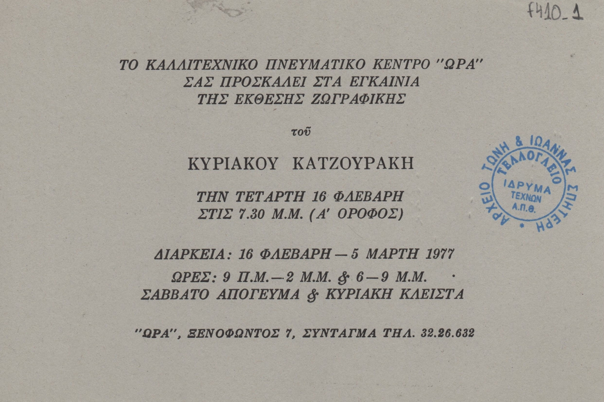 Έντυπο, στα ελληνικά, μονόφυλλο, χαρτόνι, 11,0×16,0 εκ. Πρόσκληση εγκαινίων της ατομικής έκθεσης ζωγραφικής του Κυριάκου Κατζουράκη στην Αθήνα το 1977.