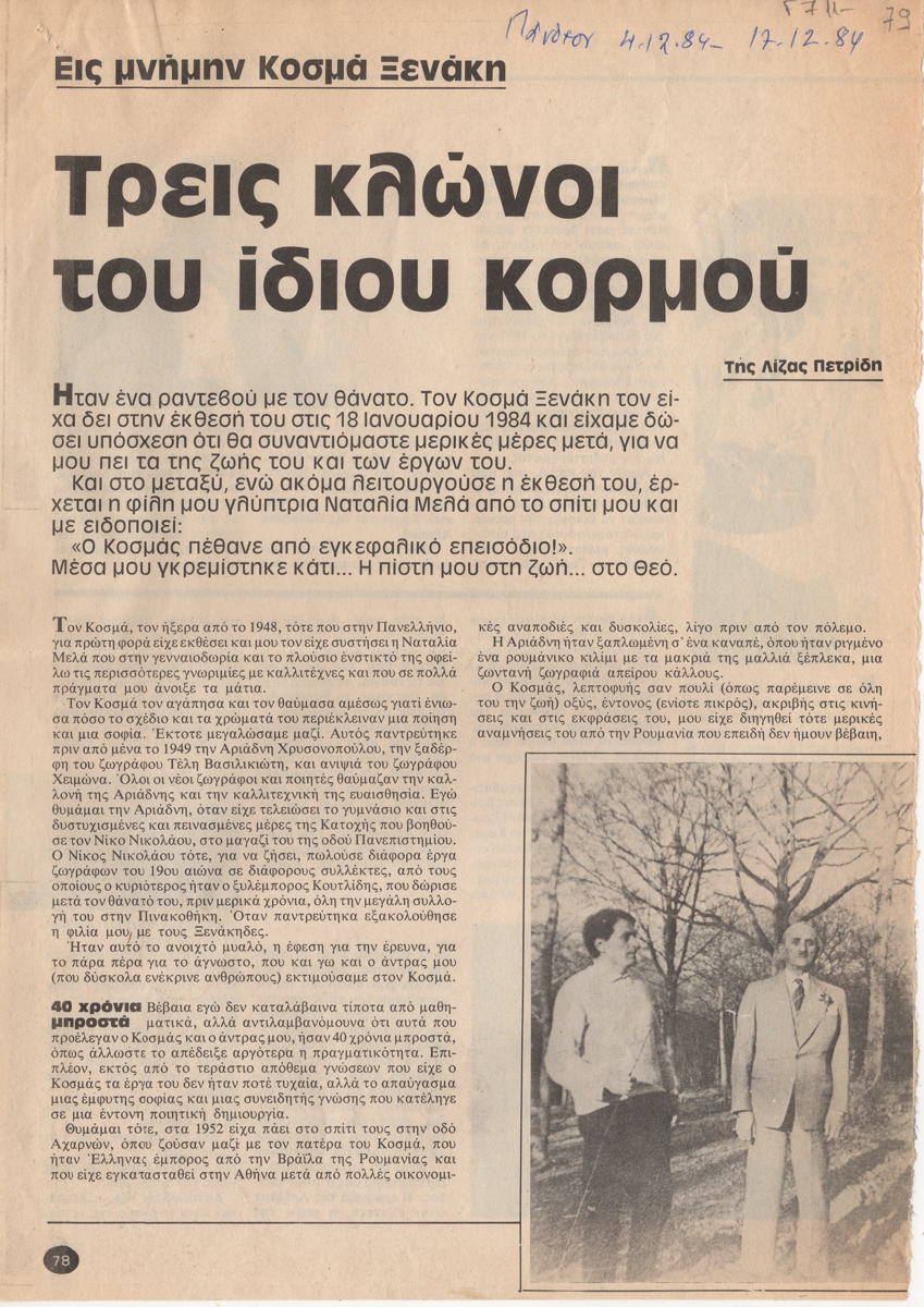 Απόκομμα, χαρτί, 3 φφ, 29×21 εκ., και 29×10.5 εκ., στα ελληνικά, δημοσίευσης άρθρου αφιερωμένου στον Κοσμά Ξενάκη, με αφορμή το θάνατο του καλλιτέχνη. Γίνεται μια αναδρομή στις ρίζες του και δίνονται πληροφορίες για την οικογένεια του.