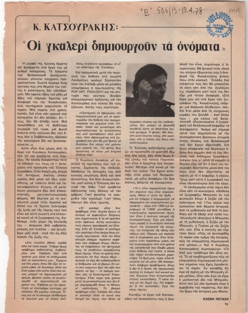 Απόκομμα περιοδικού, στα ελληνικά, χαρτί, 30,0×23,0 εκ. Συνέντευξη του ζωγράφου Κυριάκου Κατζουράκη στην δημοσιογράφο Ελένη Πετάση. Εικονογραφείται με φωτογραφία του καλλιτέχνη. Επάνω επιγραφή με τα στοιχεία της δημοσίευσης.