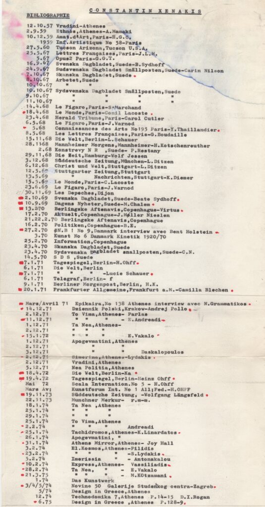 Βιβλιογραφία, δακτυλόγραφο, χαρτί, 57×21 εκ., στα γαλλικά, για τον Κωνσταντίνο Ξενάκη. Δίνονται επιγραμματικά δημοσιεύσεις που έγιναν για τον καλλιτέχνη στον ελληνικό και διεθνή Τύπο, κατάλογοι εκθέσεων και τόμοι που αναφέρονται σε αυτόν κατά την περίοδο 1957-1975.