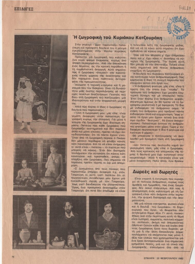Αποκόμματα περιοδικού, στα ελληνικά, χαρτί, 2 φφ, 29,2×21,0 και 18,5×7,3 εκ. Συνέντευξη του Κυριάκου Κατζουράκη με αφορμή την ατομική έκθεση ζωγραφικής του καλλιτέχνη στην Αθήνα το 1982. Εικονογραφείται με αναπαραγωγές έργων. Επάνω επιγραφή με τα στοιχεία δημοσίευσης. Στην πίσω όψη συνέντευξη του σκηνοθέτη Ανδρέα Βουτσινά στον Βαγγέλη Ψυρράκη και απόσπασμα δισκοπαρουσίασης για την ηχογράφηση του έργου του Μ. Καλομοίρη “Η συμφωνία της Λεβεντιάς” σε διεύθυνση του Βύρωνα Φιδετζή.