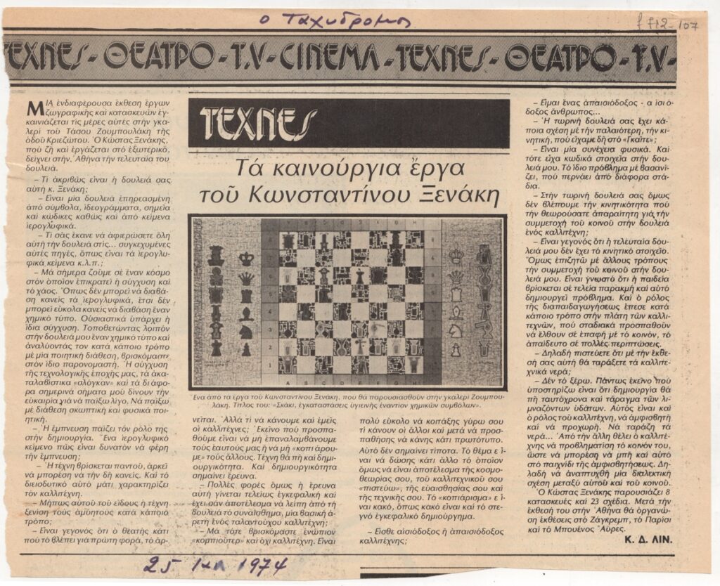 Απόκομμα, χαρτί, 20×24,5 εκ., στα ελληνικά, δημοσίευσης συνέντευξης του Κωνσταντίνου Ξενάκη, με αφορμή ατομική του έκθεση στην γκαλερί Ζουμπουλάκη στην Αθήνα.