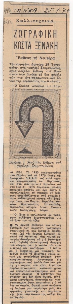 Απόκομμα, χαρτί, 24×5 εκ., στα ελληνικά, δημοσίευσης κριτικής έκθεσης του Κωνσταντίνου Ξενάκη, η οποία διεξάγεται στην Γκαλερί Ζουμπουλάκη, στην Αθήνα.