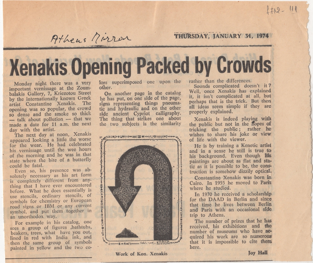 Απόκομμα, χαρτί, 15,5×18 εκ., στα αγγλικά, δημοσίευσης άρθρου το οποίο αναφέρεται στα εγκαίνια ατομικής έκθεσης του Κωνσταντίνου Ξενάκη στην γκαλερί Ζουμπουλάκη στην Αθήνα.