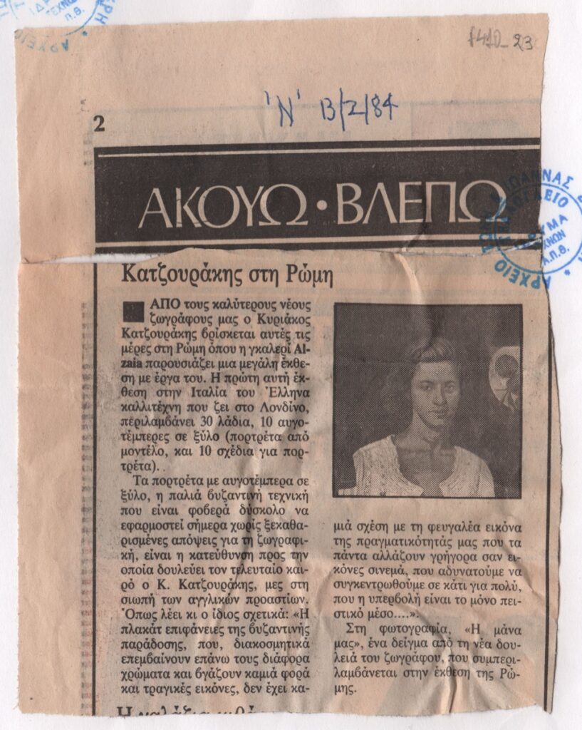 Απόκομμα, έντυπο, στα ελληνικά, χαρτί, 14,8×11,5 εκ., όπου δημοσιεύεται παρουσίαση της ατομικής έκθεσης ζωγραφικής του Κυριάκου Κατζουράκη στη Ρώμη το 1984. Το δημοσίευμα εντάσσεται στη στήλη “Ακούω-Βλέπω”. Επάνω επιγραφή με τα στοιχεία δημοσίευσης.