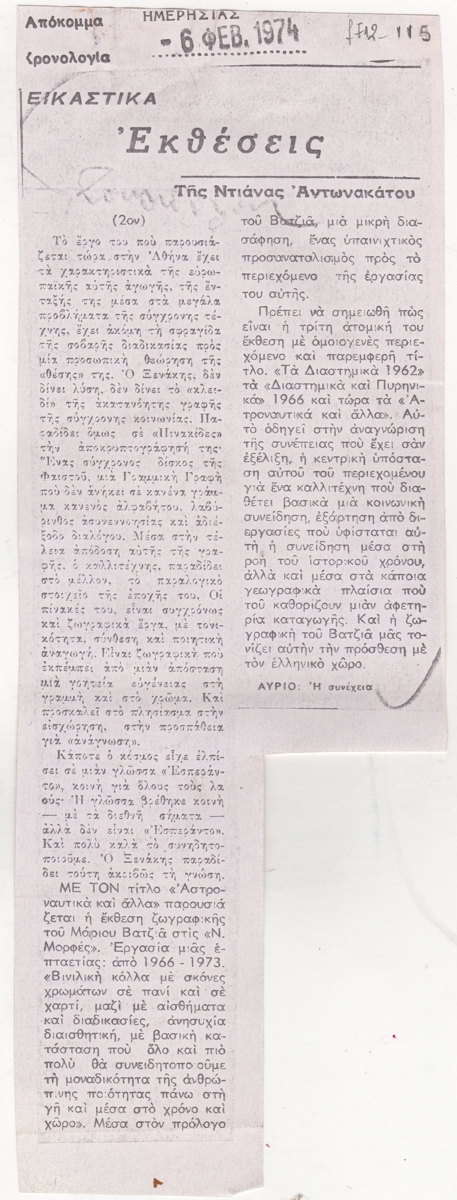Φωτοαντίγραφο, χαρτί, 27,5×10 εκ., στα ελληνικά, δημοσίευσης κριτικής έκθεσης του Κωνσταντίνου Ξενάκη, η οποία διεξάγεται στην γκαλερί Ζουμπουλάκη στην Αθήνα. Στο ίδιο, κριτική για την έκθεση με τίτλο “Αστροναυτικά και άλλα” του Μάριου Βατζιά στην γκαλερί Νέες Μορφές στην Αθήνα.