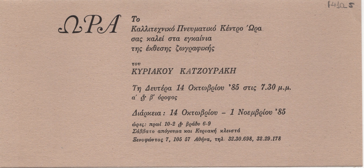 Έντυπο, στα ελληνικά, χαρτόνι, μονόφυλλο, 9,2×19,7 εκ. Πρόσκληση ατομικής έκθεσης ζωγραφικής του Κυριάκου Κατζουράκη στην Αθήνα το 1985.