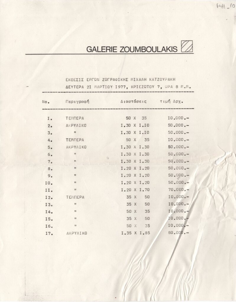 Κείμενο, δακτυλόγραφο, στα ελληνικά, χαρτί, 26,5×20,8 εκ. Τιμοκατάλογος των έργων της ατομικής έκθεσης του Μιχάλη Κατζουράκη στην Αθήνα το 1977.