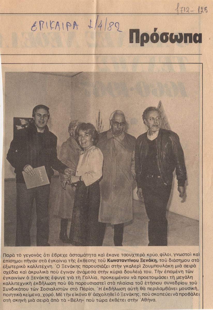 Απόκομμα, χαρτί, 19×19 εκ., στα ελληνικά, δημοσίευσης άρθρου αναφερόμενου στα εγκαίνια ατομικής έκθεσης του Κωνσταντίνου Ξενάκη, στην γκαλερί Ζουμπουλάκη στην Αθήνα.