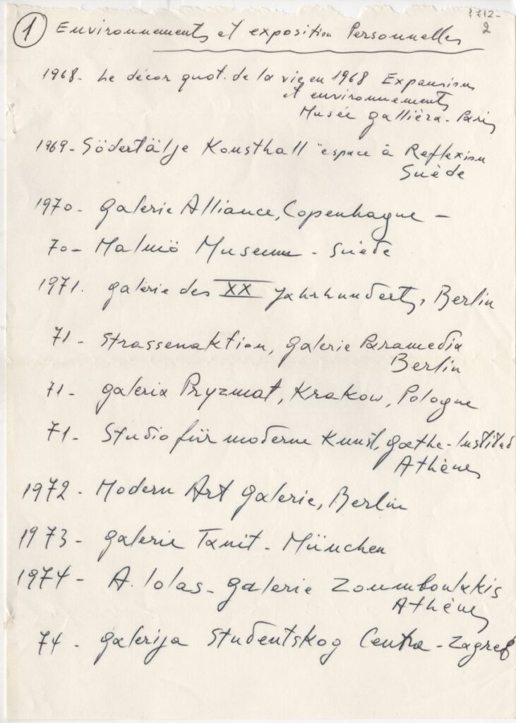 Κατάλογος εκθέσεων, χειρόγραφο με μαύρο μελάνι, χαρτί, 2 φφ, 29,5×21 εκ., στα γαλλικά, του Κοσμά Ξενάκη.