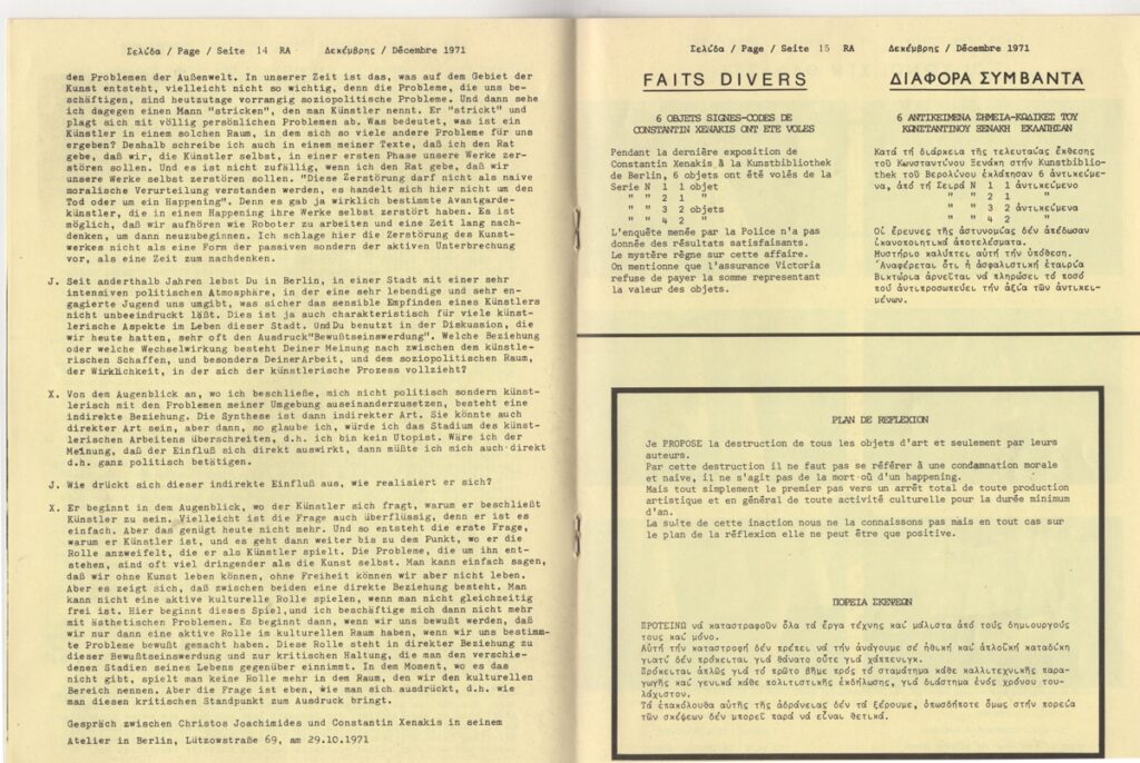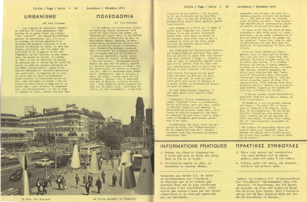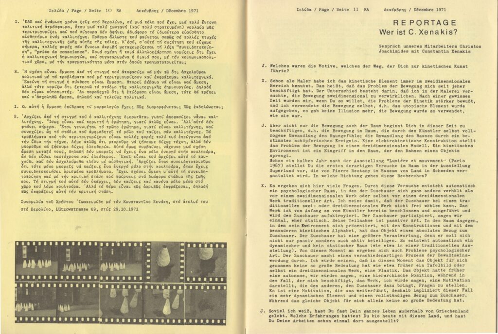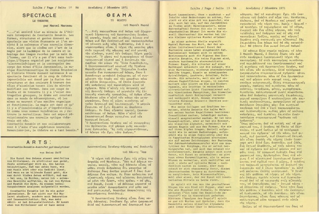 Έντυπο, χαρτί, 14 φφ, 28,5×21,5 εκ., στα ελληνικά, γαλλικά και γερμανικά, έκθεσης του Κωνσταντίνου Ξενάκη. Φέρει τη μορφή τεύχους περιοδικού με αρχισυντάκτη τον καλλιτέχνη. Περιέχει διάφορα κείμενά του, όπου ξεδιπλώνει τη σκέψη του και εξηγεί το έργο του. Ακόμη, κείμενο του Yona Friedman “Urbanisme”, συνομιλία του καλλιτέχνη με τον Χρήστο Ιωακειμίδη και κείμενο του Marcel Marceau “Spectacle”.