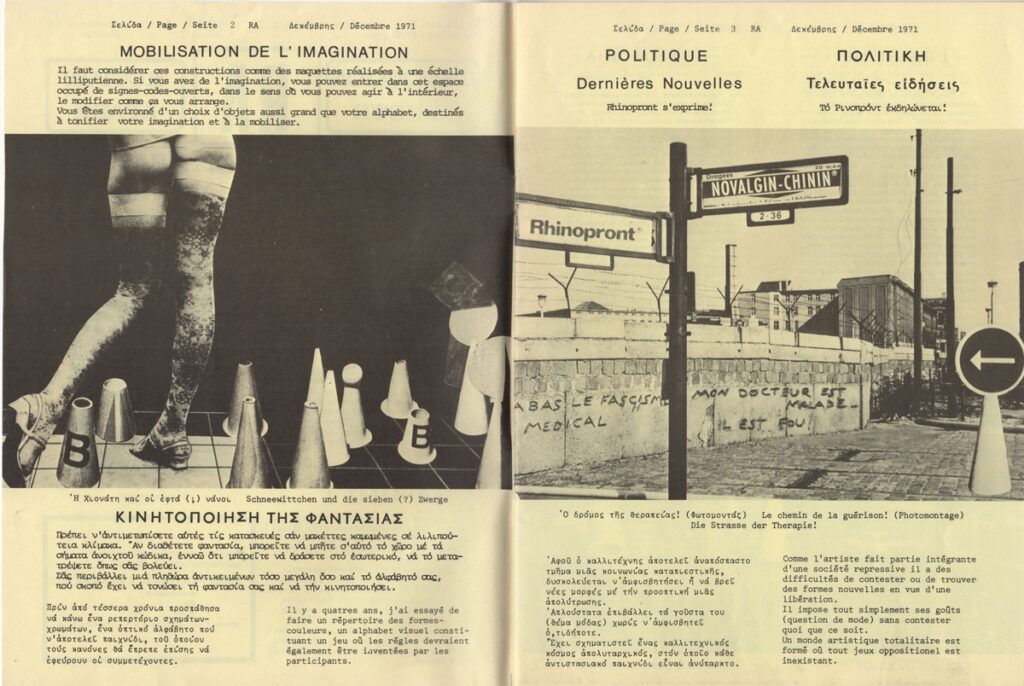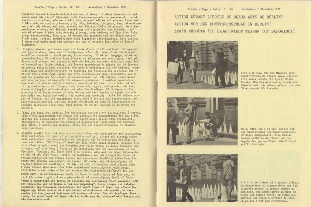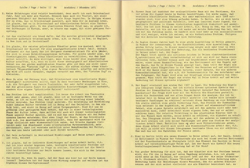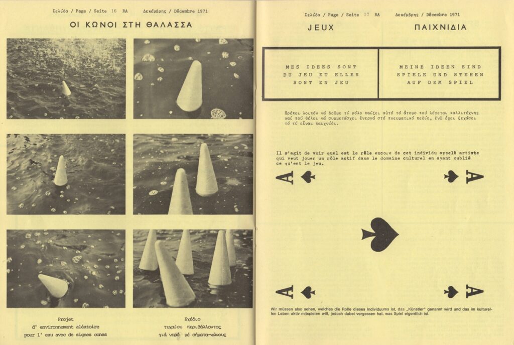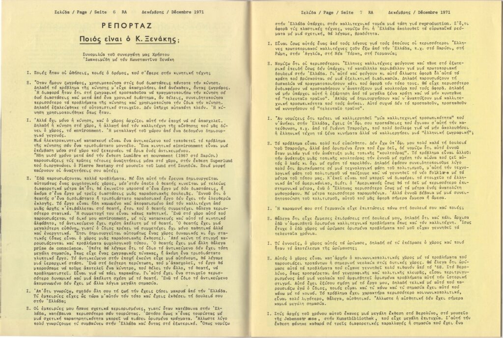 Έντυπο, χαρτί, 14 φφ, 28,5×21,5 εκ., στα ελληνικά, γαλλικά και γερμανικά, έκθεσης του Κωνσταντίνου Ξενάκη. Φέρει τη μορφή τεύχους περιοδικού με αρχισυντάκτη τον καλλιτέχνη. Περιέχει διάφορα κείμενά του, όπου ξεδιπλώνει τη σκέψη του και εξηγεί το έργο του. Ακόμη, κείμενο του Yona Friedman “Urbanisme”, συνομιλία του καλλιτέχνη με τον Χρήστο Ιωακειμίδη και κείμενο του Marcel Marceau “Spectacle”.