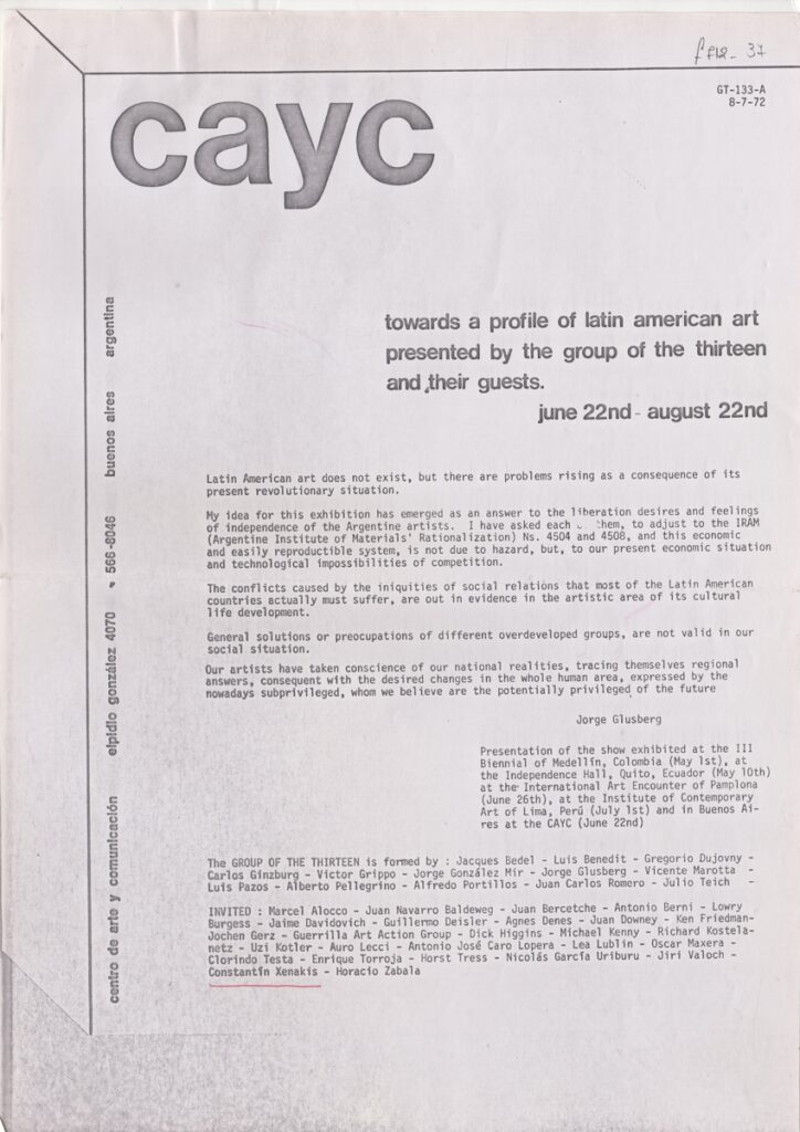 Jorge Glusberg, Jacques Bedel, Luis Benedit, Gregorio Dujovny, Carlos Ginzburg, Victor Grippo, Jorge Gonzalez Mir, Vicente Marotta, Luis Pazos, Alberto Pellegrino, Alfredo Portillos, Juean Carlos Romero, Julio Tecih, Marcel Alocco, Juan Navarro Baldeweg, Juan Bercetche, Antonio Berni, Lowry Burgess, Jaime Davidovich, Guillermo Deisler, Agnes Denes, Juan Downey, Ken Friedman, Jochen Gerz, Guerilla Art Action Group, Dick Higgins, Michael Kenny, Richard Kostelanetz, Uzi Kotler, Auro Lecci, Antonio José Caro Lopera, Lea Lublin, Oskar Maxera, Clorindo Testa, Enrique Torroja, Horst Tress, Nicolás García Uriburu, Jiri Valoch, Constantin Xenakis, Horacio Zabala.