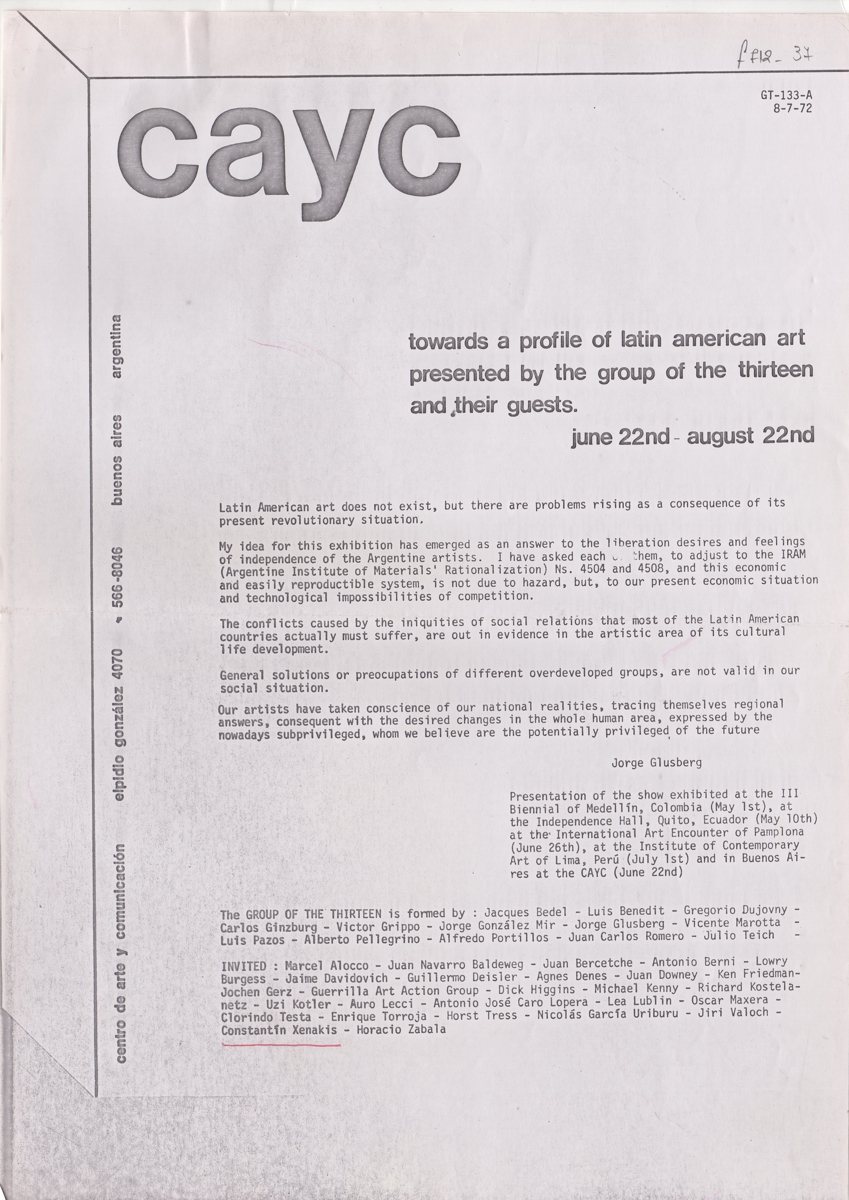 Φωτοαντίγραφο, χαρτί, 2 φφ, 30×21 εκ., στα αγγλικά. Πρόκειται για έντυπο ομαδικής έκθεσης καλλιτεχνών, η οποία διεξάγεται στην Αργεντινή. Σε αυτή συμμετέχουν: