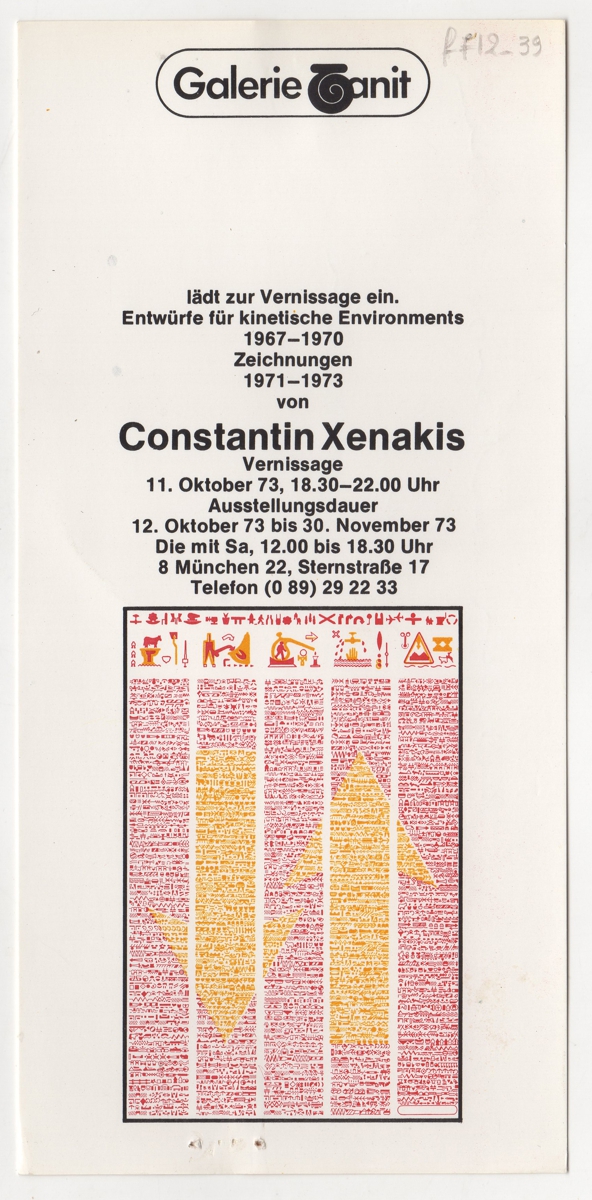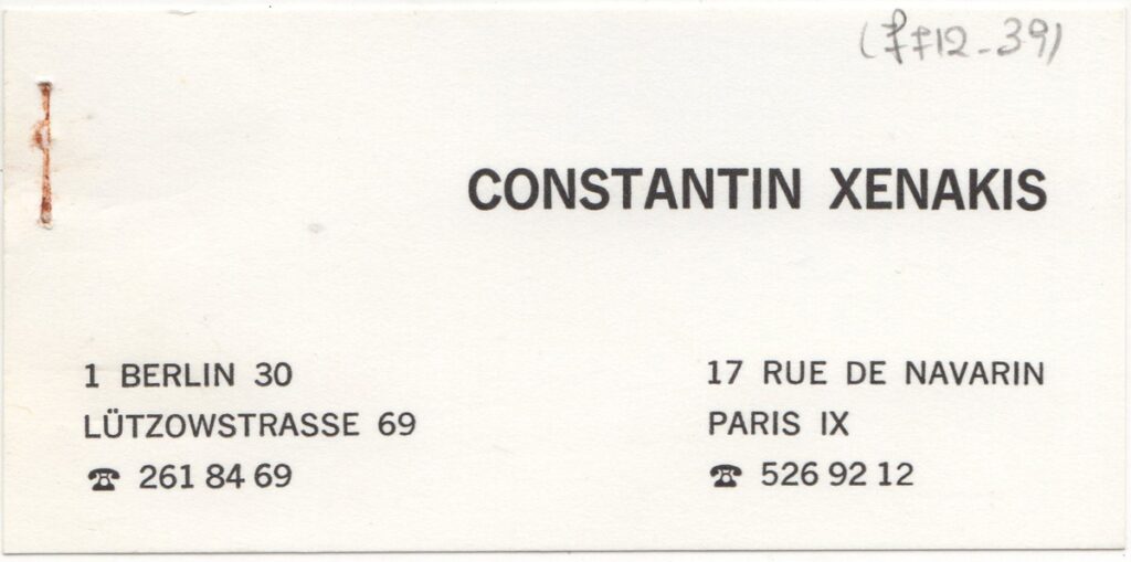 Πρόσκληση, χαρτόνι, 21×10 εκ., στα ελληνικά, εγκαινίων έκθεσης του Κωνσταντίνου Ξενάκη. Εικονογραφείται και φέρει επιγραφές.