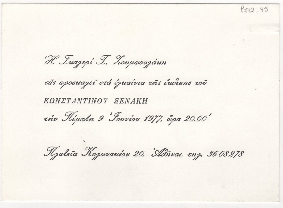 Πρόσκληση, χαρτόνι, 12,5×17,5 εκ., στα ελληνικά, εγκαινίων ατομικής έκθεσης του Κωνσταντίνου Ξενάκη.