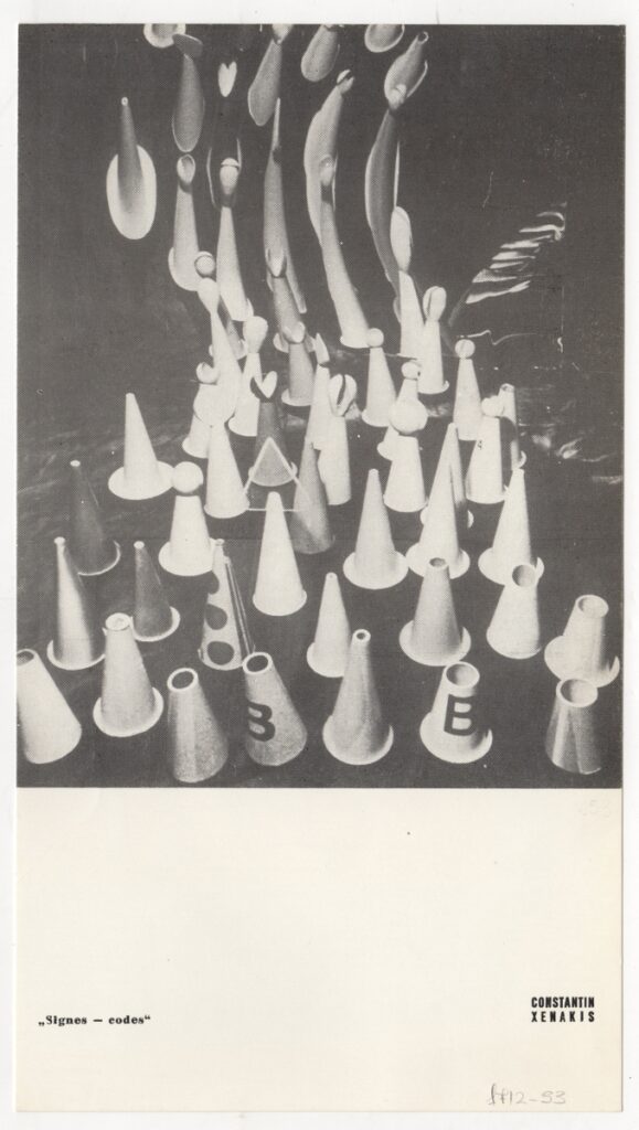 Έντυπο, χαρτί ιλλουστρασιόν, 23×13 εκ., με αναπαραγωγή έργου του Κωνσταντίνου Ξενάκη, α/μ.