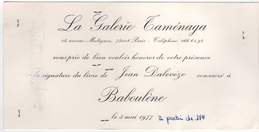 Έντυπο, στα γαλλικά, μονόφυλλο, χαρτόνι, 10,7×21,3 εκ. Πρόσκληση σε υπογραφή βιβλίων του Jean Dalevéze για τον ζωγράφο Baboulene στο Παρίσι το 1977. Στην επιφάνεια της πρόσκληση επιγραφή.
