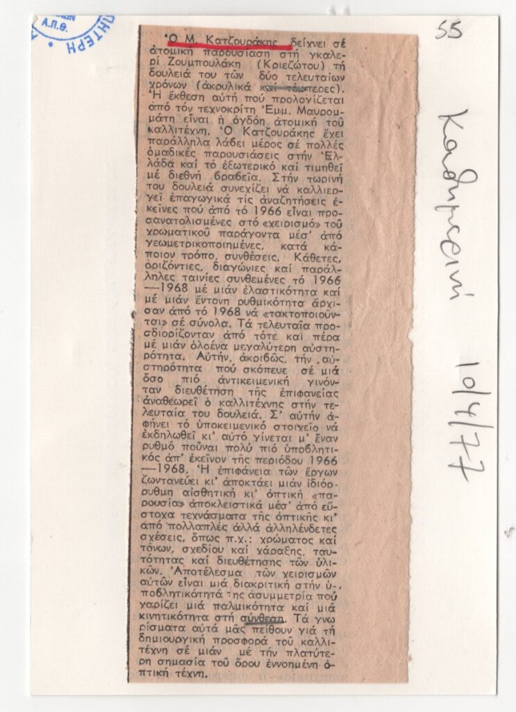 Απόκομμα, έντυπο, στα ελληνικά, χαρτί, 15,3×6,5 εκ., όπου δημοσιεύεται κριτική της ατομικής έκθεσης ζωγραφικής του Μιχάλη Κατζουράκη στην Αθήνα το 1977. Το απόκομμα βρέθηκε συρραμμένο στην πίσω όψη πρόσκλησης ατομικής έκθεσης της Λευκής Χριστίδου στην Αθήνα. Επιγραφή με τα στοιχεία δημοσίευσης.