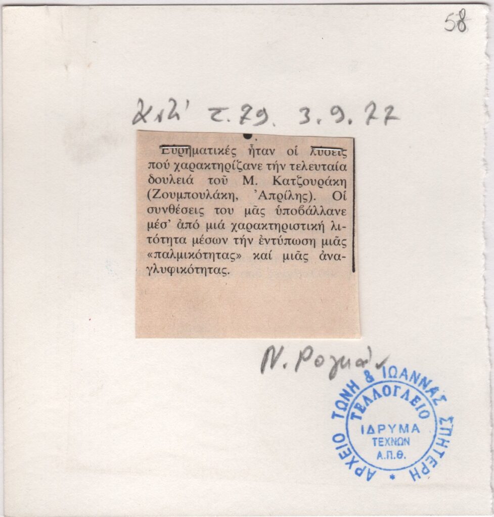 Απόκομμα περιοδικού, στα ελληνικά, χαρτί, 4,3×10,5 εκ. Σύντομη κριτική της ατομικής έκθεσης ζωγραφικής του Μιχάλη Κατζουράκη στην Αθήνα το 1977. Το απόκομμα είναι στερεωμένο με συρραπτικό στην πίσω όψη αποκόμματος πρόσκληση της Galerie de Seine στο Παρίσι (λείπουν τα στοιχεία της έκθεσης). Επιγραφή με τα στοιχεία δημοσίευσης.