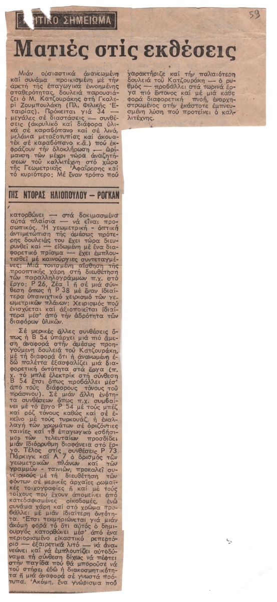 Απόκομμα, έντυπο, στα ελληνικά, χαρτί, 25,3×11,3 εκ. Κριτική της Ντόρας Ηλιοπούλου-Ρογκάν για την ατομική έκθεση ζωγραφικής του Μιχάλη Κατζουράκη στην Αθήνα το 1977 (;).