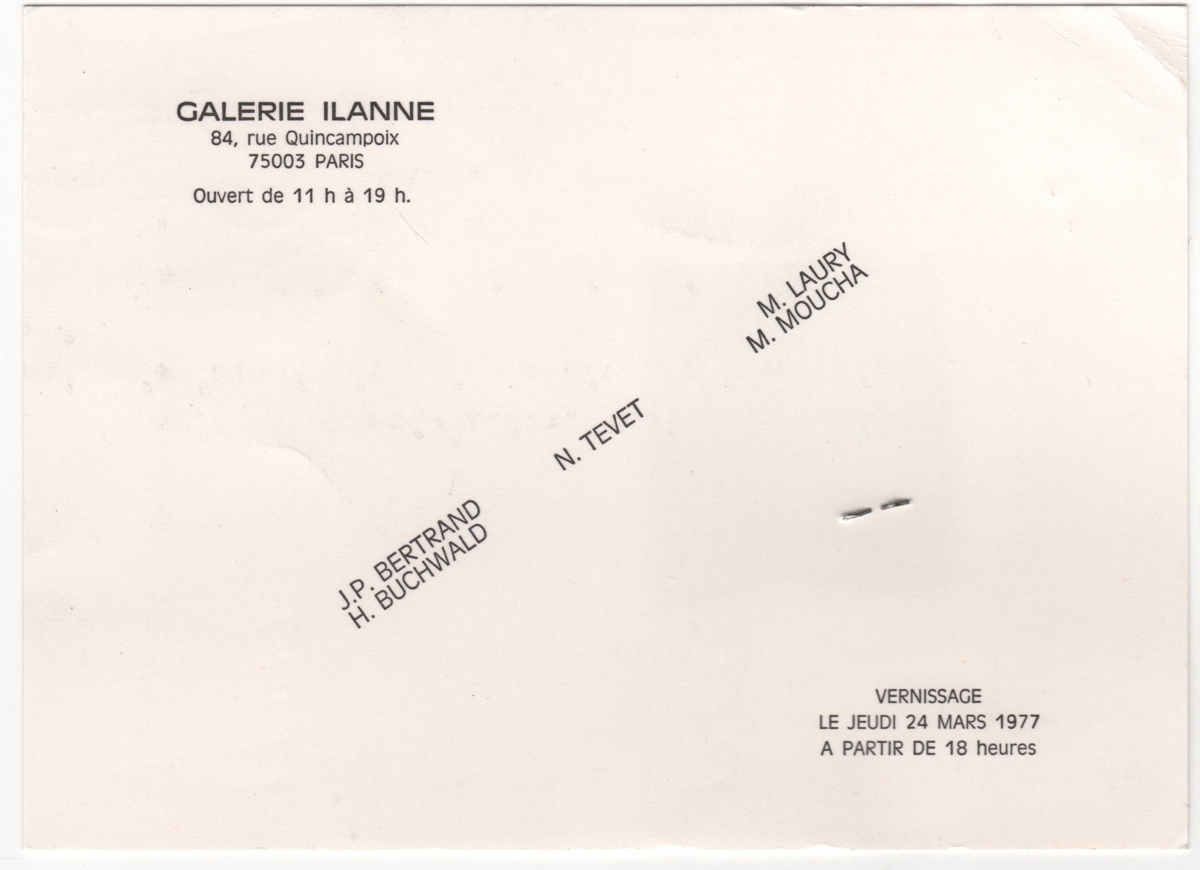 Έντυπο έκθεσης, μονόφυλλο, χαρτόνι, 11,0×15,2 εκ. Πρόσκληση της ομαδικής έκθεσης των J. P. Bertrand, H. Buchwald, N. Tenet, M. Laury και M. Moucha στο Παρίσι το 1977. Χρησιμοποιήθηκε ως βάση για απόκομμα εφημερίδας με κριτική έκθεσης του Μ. Κατζουράκη.
