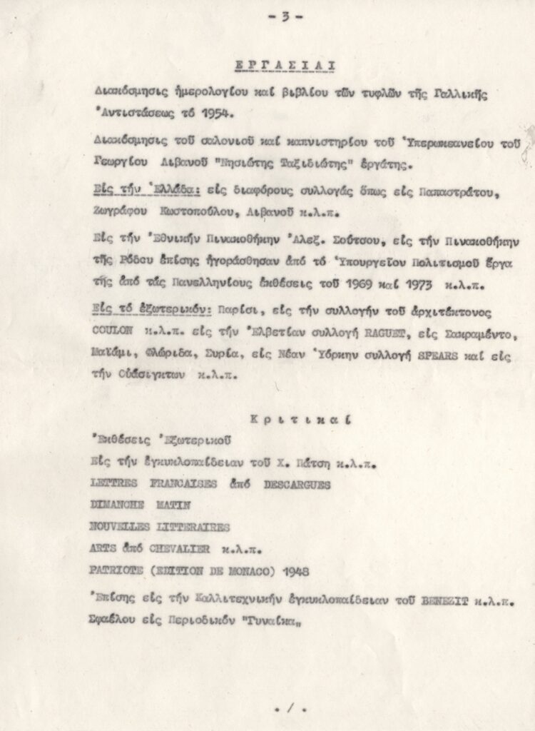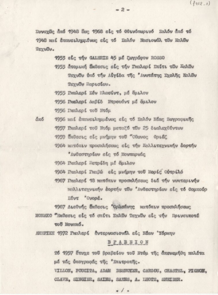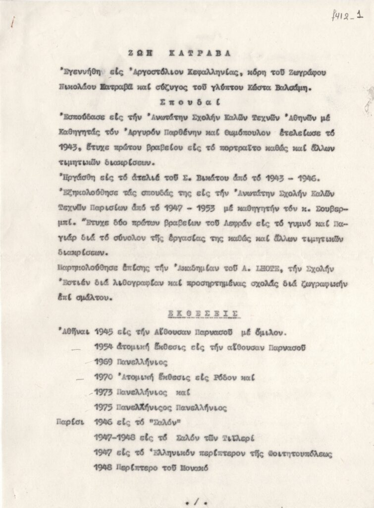 Κείμενο, δακτυλόγραφο, στα ελληνικά, χαρτί, 4 φφ., 28,7×21,2 εκ. Βιογραφικό σημείωμα της ζωγράφου Ζωής Κατραβά. Αναφέρονται σπουδές, ατομικές εκθέσεις, βραβεύσεις, άλλες εργασίες και κριτικές.