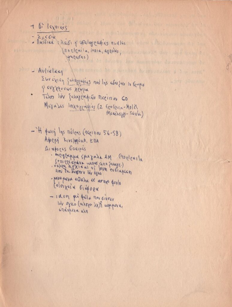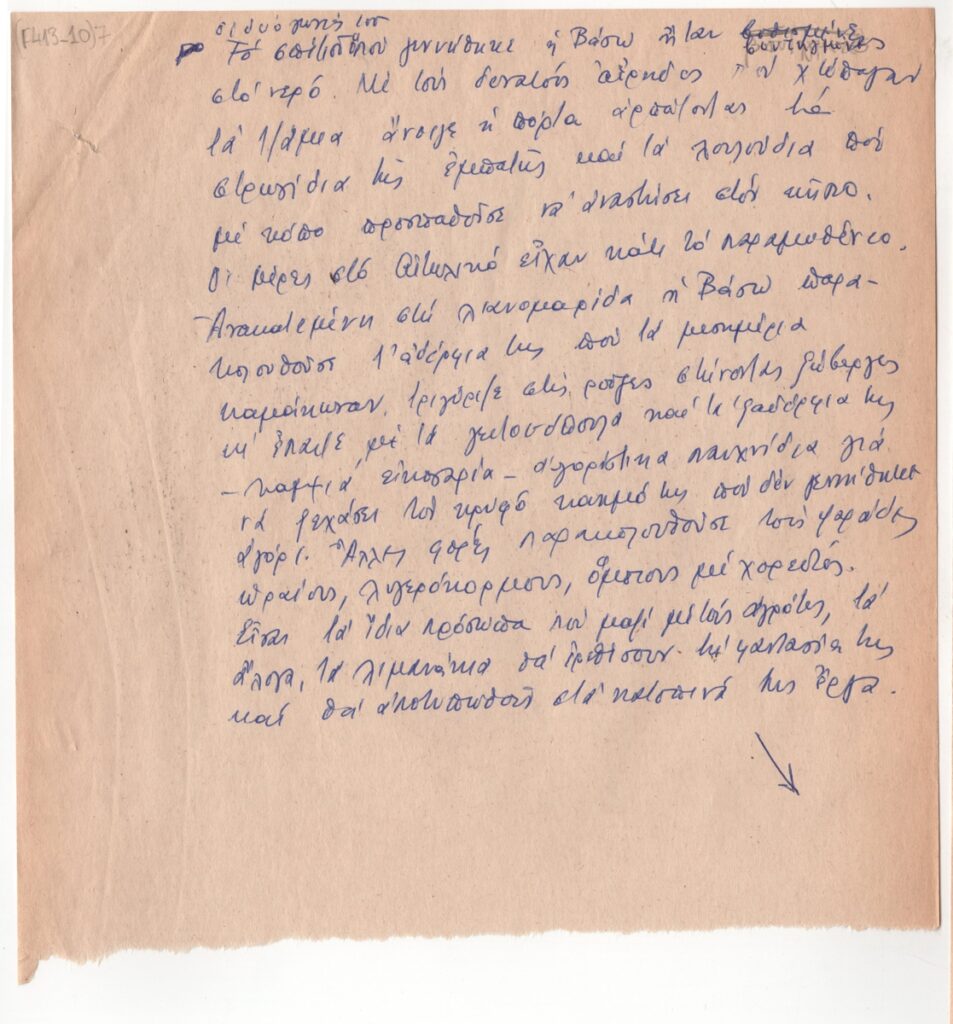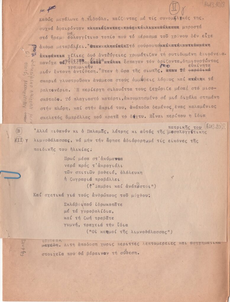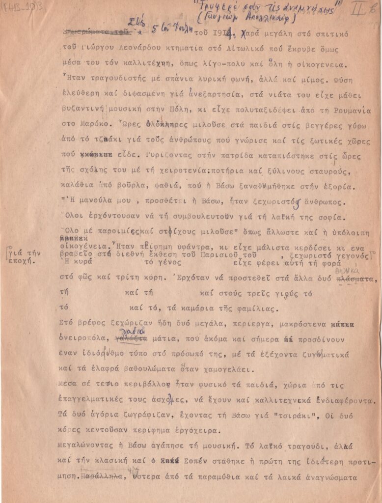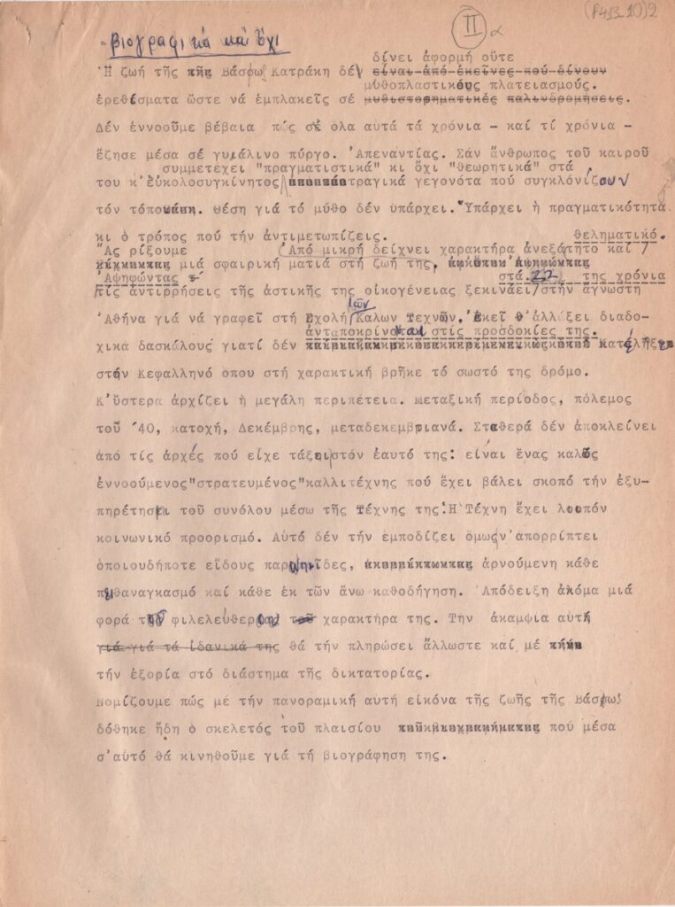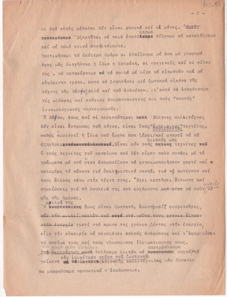 Κείμενο, δακτυλόγραφο, με συμπληρώσεις και διορθώσεις, χειρόγραφες, με μολύβι και μαύρο μελάνι, στα ελληνικά, σε χαρτί, 43 φφ, 28,2×21,5 εκ. Προσχέδιο του κειμένου της μονογραφίας που ετοίμαζε ο Τώνης Σπητέρης για την Βάσω Κατράκη. Οι σελίδες φέρουν χειρόγραφη αρίθμηση πάνω δεξιά.