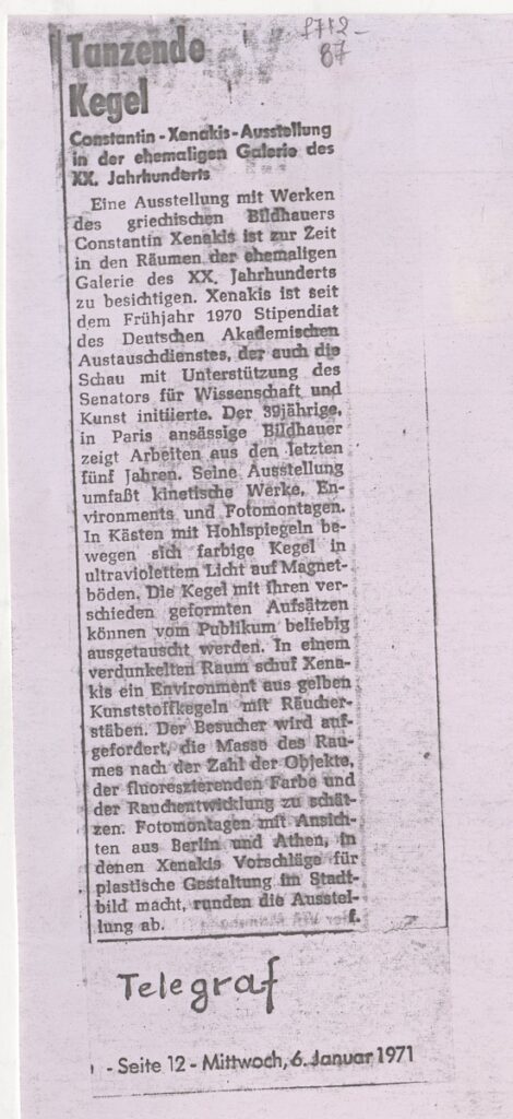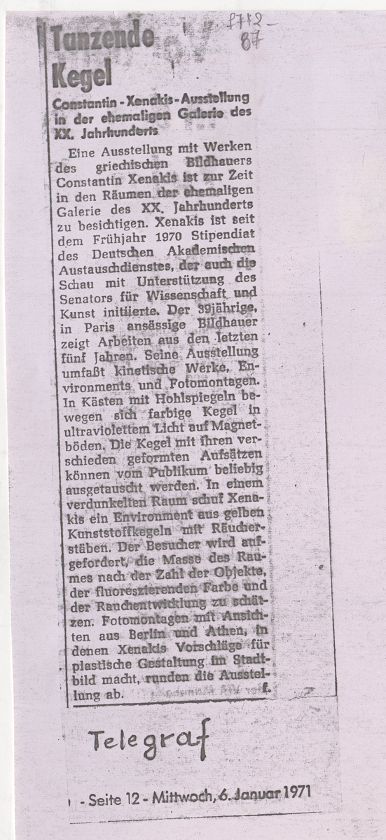 Φωτοαντίγραφο, χαρτί, 19×17 εκ., στα γερμανικά, δημοσίευσης άρθρου αναφερόμενου στα εγκαίνια έκθεσης του Κωνσταντίνου Ξενάκη στο Βερολίνο. Δίνονται πληροφορίες για την καλλιτεχνική δραστηριότητα του Ξενάκη.
