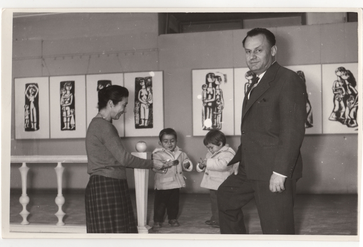 Φωτογραφία, α/μ, σε φωτογραφικό χαρτί, 11,8×18,2 εκ. Η Βάσω Κατράκη με τον σύζυγο και τα δύο παιδιά της σε έκθεση της καλλιτέχνιδας στη Θεσσαλονίκη.