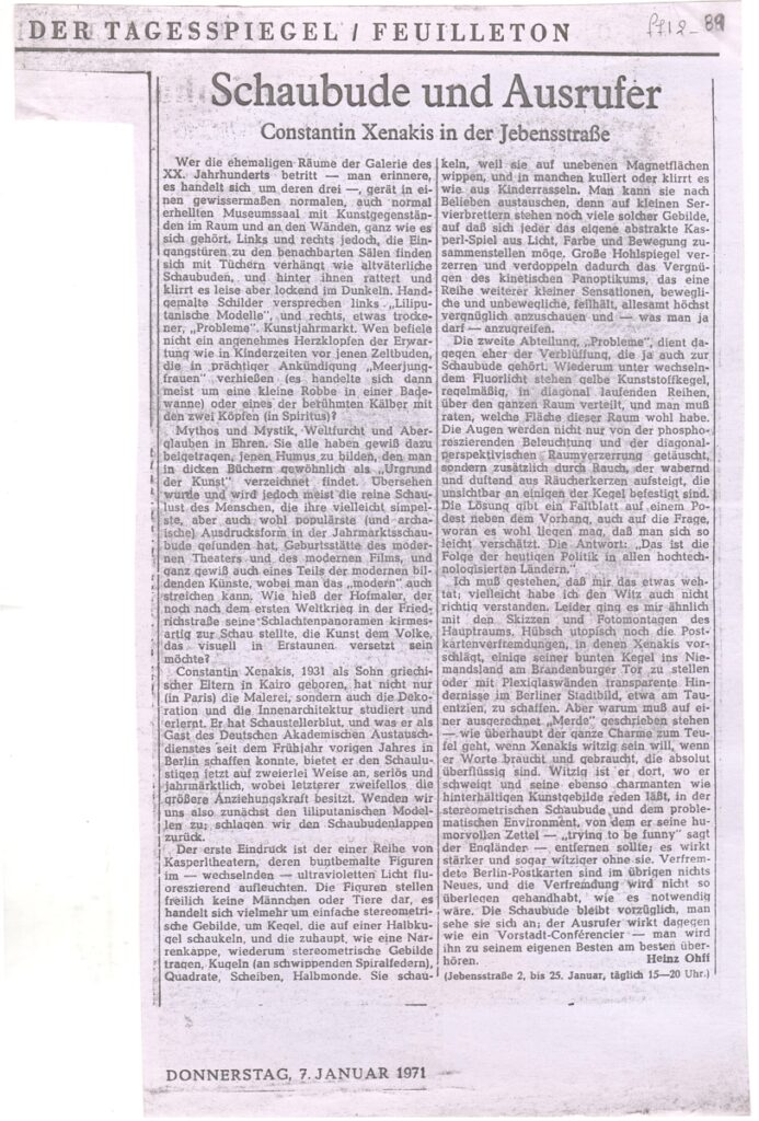 Φωτοαντίγραφο, χαρτί, 26,5×17,5 εκ., στα γερμανικά, δημοσίευσης κριτικής έκθεσης του Κωνσταντίνου Ξενάκη, η οποία διεξάγεται στο Βερολίνο.