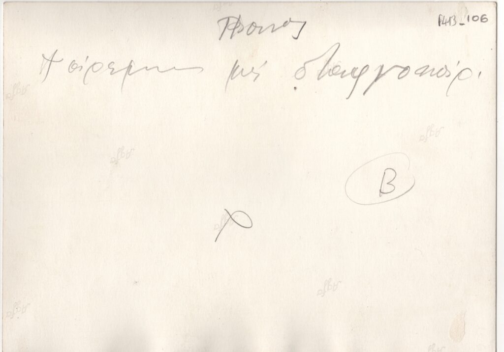 Φωτογραφία, α/μ, σε φωτογραφικό χαρτί, 7,5×10,5 εκ. Στην πίσω όψη επιγραφή.