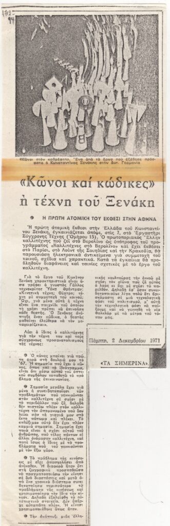 Φωτοαντίγραφο, χαρτί, 35×11 εκ., στα ελληνικά, δημοσίευσης άρθρου αναφερόμενου στην πρώτη ατομική έκθεση του Κωνσταντίνου Ξενάκη στην Αθήνα. Η έκθεση διεξάγεται στο Εργαστήρι Σύγχρονης Τέχνης του Γερμανικού Ινστιτούτου. Δίνονται αποσπάσματα δηλώσεων του καλλιτέχνη για το έργο του.
