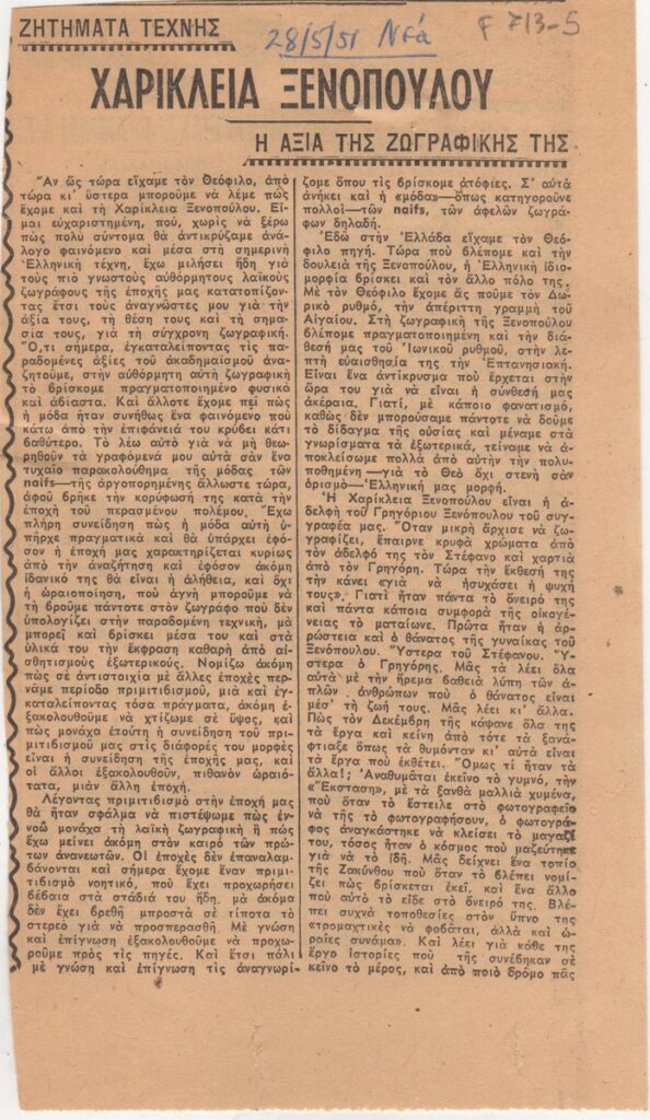 Απόκομμα, χαρτί, 19×11 εκ., στα ελληνικά, δημοσίευσης κριτικής έκθεσης της Χαρίκλειας Ξενοπούλου, η οποία διεξάγεται στον Φιλολογικό Σύλλογο Παρνασσό στην Αθήνα.