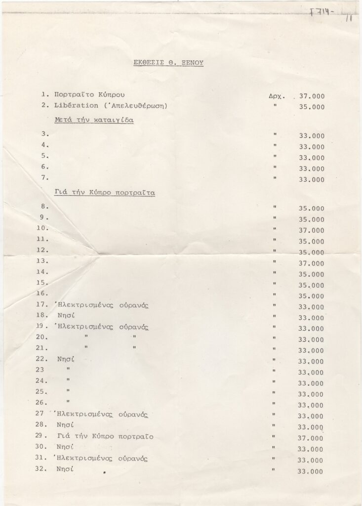 Τιμοκατάλογος, χαρτί, 30×21 εκ., στα ελληνικά, έργων του Θεόδωρου Ξένου.