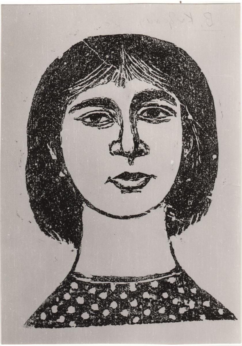 Ασπρόμαυρη εκτυπωμένη φωτογραφία έργου της Βάσως Κατράκη. Στην πίσω όψη, επιγραφές.