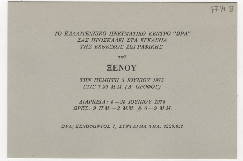 Πρόσκληση, χαρτόνι, 11×16 εκ., στα ελληνικά, εγκαινίων ατομικής έκθεσης ζωγραφικής του Θεόδωρου Ξένου.