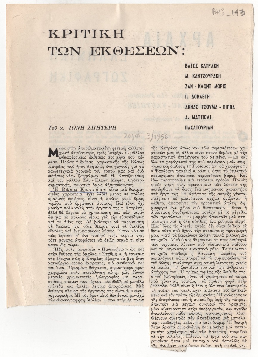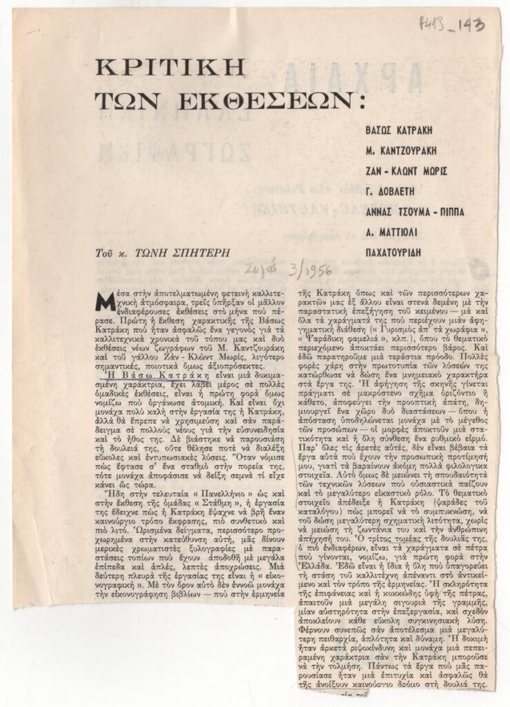 Απόκομμα του περιοδικού “Ζυγός”, τεύχος 03/1956, όπου δημοσιεύεται απόσπασμα άρθρου του Τώνη Σπητέρη με κριτική για την ατομική έκθεση χαρακτικής της Βάσως Κατράκη.
