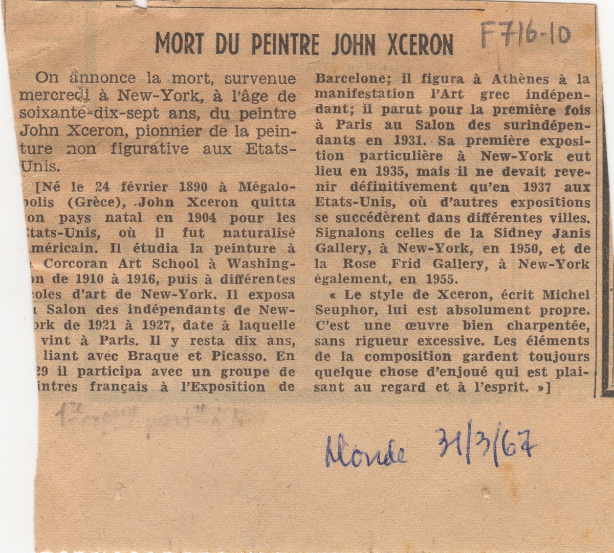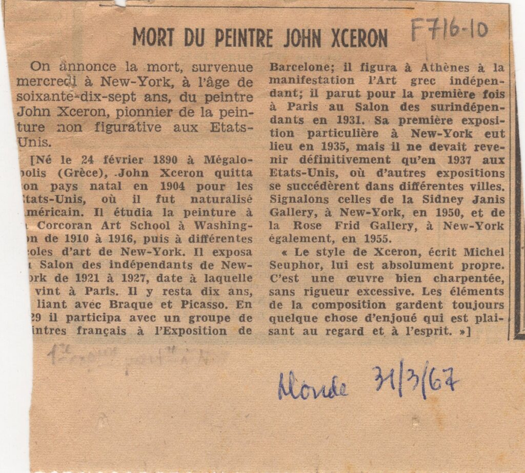 Απόκομμα, χαρτί, 10×10 εκ., στα γαλλικά, δημοσίευσης άρθρου αναφερόμενου στο θάνατο του Γιάννη Ξέρον. Δίνονται βιογραφικές πληροφορίες για τον καλλιτέχνη.