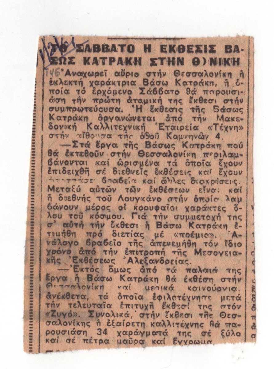 Απόκομμα εφημερίδας (01/02/1961). Αναφορά στην επικείμενη έκθεση της χαράκτριας Βάσως Κατράκη στη Θεσσαλονίκη.