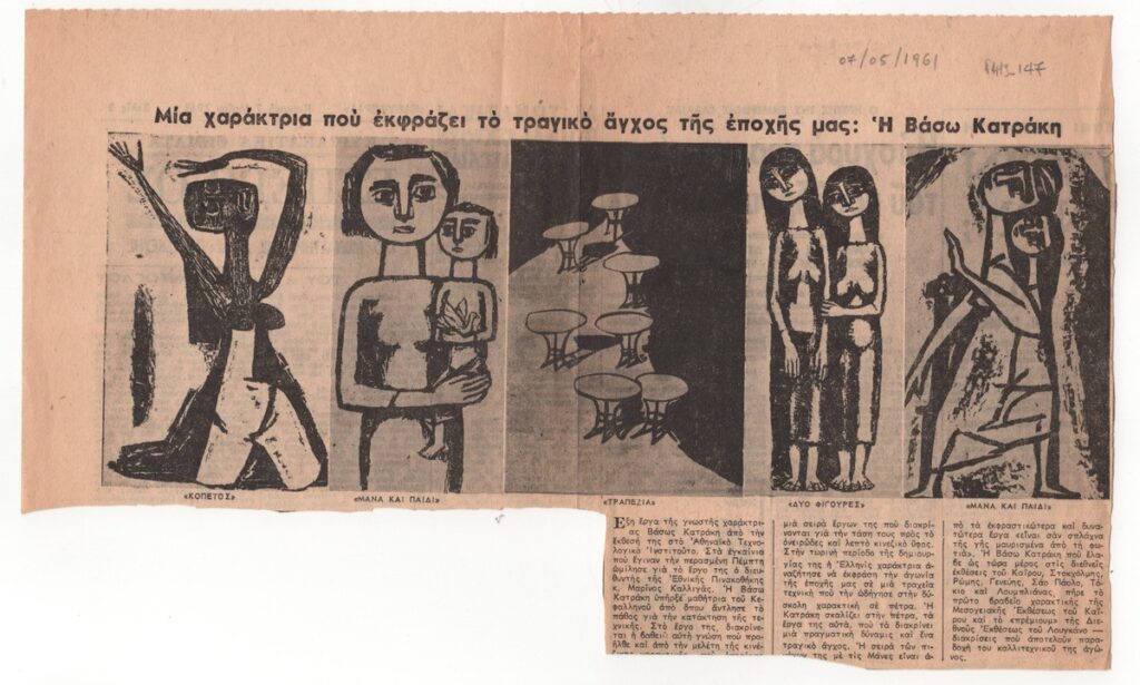 Απόκομμα εφημερίδας (07/05/1961). Δημοσίευμα για την ατομική έκθεση χαρακτικής της Βάσως Κατράκη στην Αθήνα.