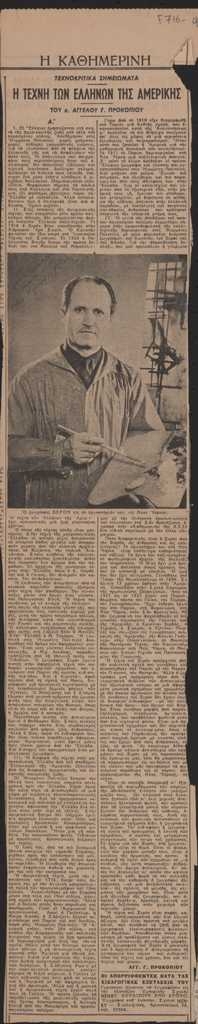 Απόκομμα, χαρτί, 55,5×10,5 εκ., στα ελληνικά, δημοσίευσης άρθρου το οποίο αναφέρεται στο καλλιτεχνικό έργο του Γιάννη Ξέρον, παράδειγμα Ελλήνων ζωγράφων που ζούν και δραστηριοποιούνται στην Αμερική.