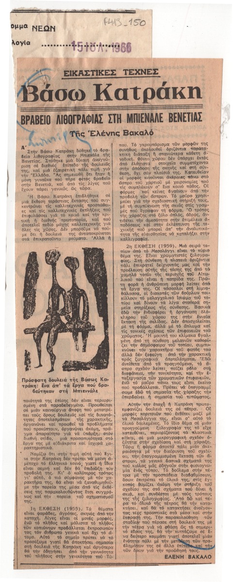 Απόκομμα της εφημερίδας “Τα Νέα” (15/07/1966). Άρθρο της Ελένης Βακαλό με αναδρομή στο έργο της Βάσως Κατράκη με αφορμή το βραβείο λιθογραφίας στη Μπιενάλε Βενετίας το 1966. Στο άρθρο γίνεται κριτική των ατομικών εκθέσεων της καλλιτέχνιδας στην Αθήνα το 1955 και 1959.