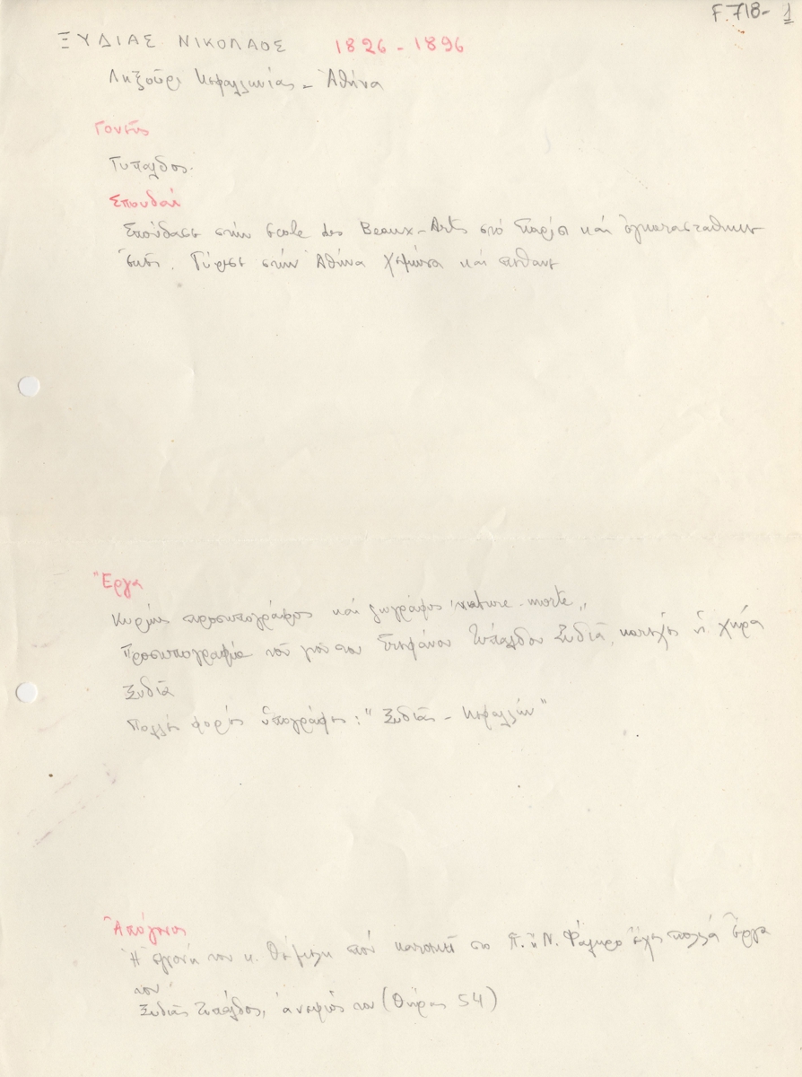 Βιογραφικό, χειρόγραφο με μολύβι, χαρτί, 28,5×21,5 εκ., στα ελληνικά, του Νικόλαου Ξυδιά. Περιέχει σπουδές και έργα του καλλιτέχνη.
