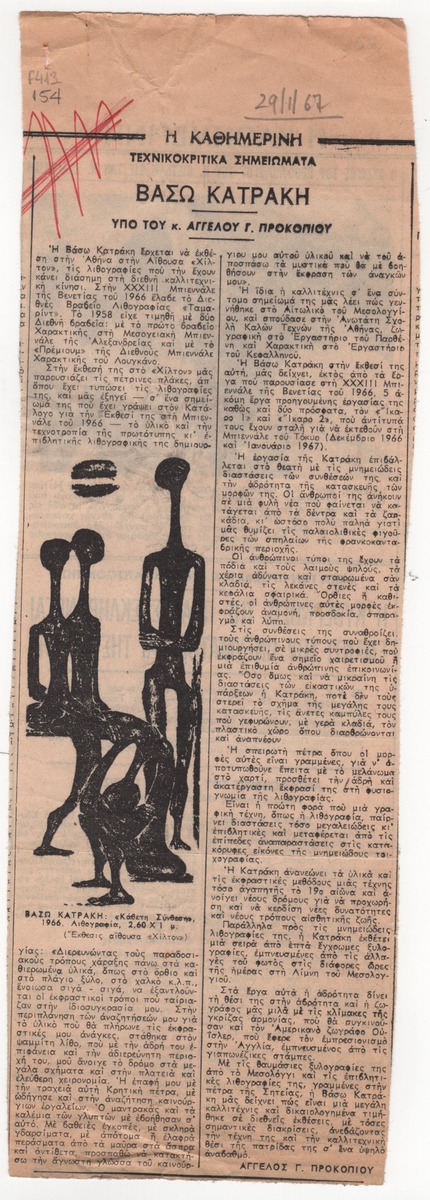 Απόκομμα εφημερίδας (29/10/1967). Κριτική του Άγγελου Γ. Προκοπίου για την ατομική έκθεση χαρακτικής της Βάσως Κατράκη στην Αθήνα.